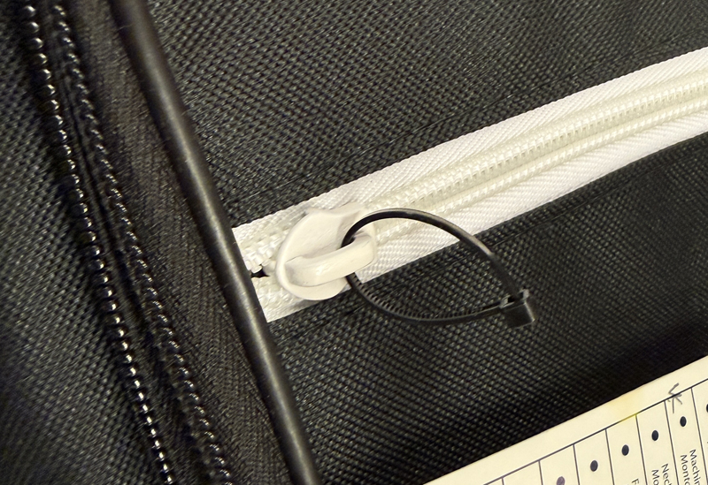 ケース外ポケットのファスナーつまみが取れており、結束バンドで補修しています。