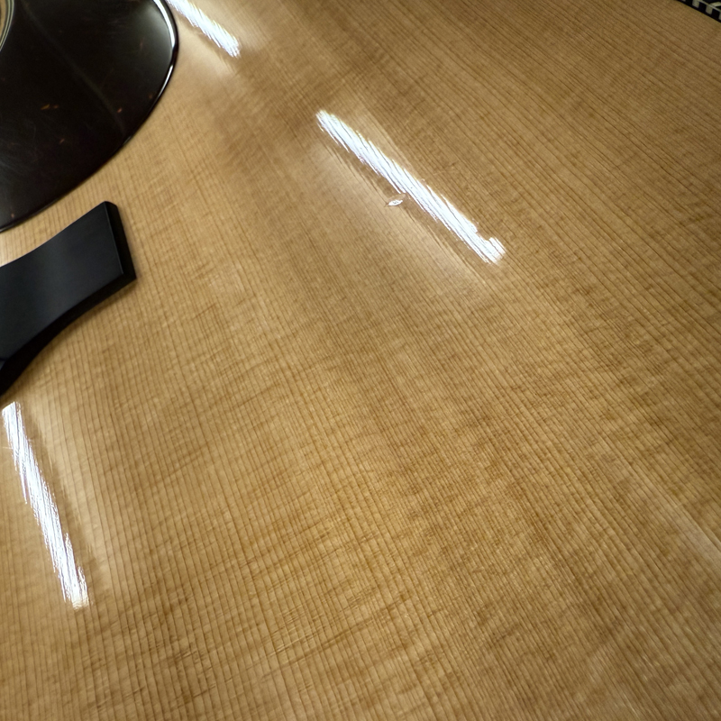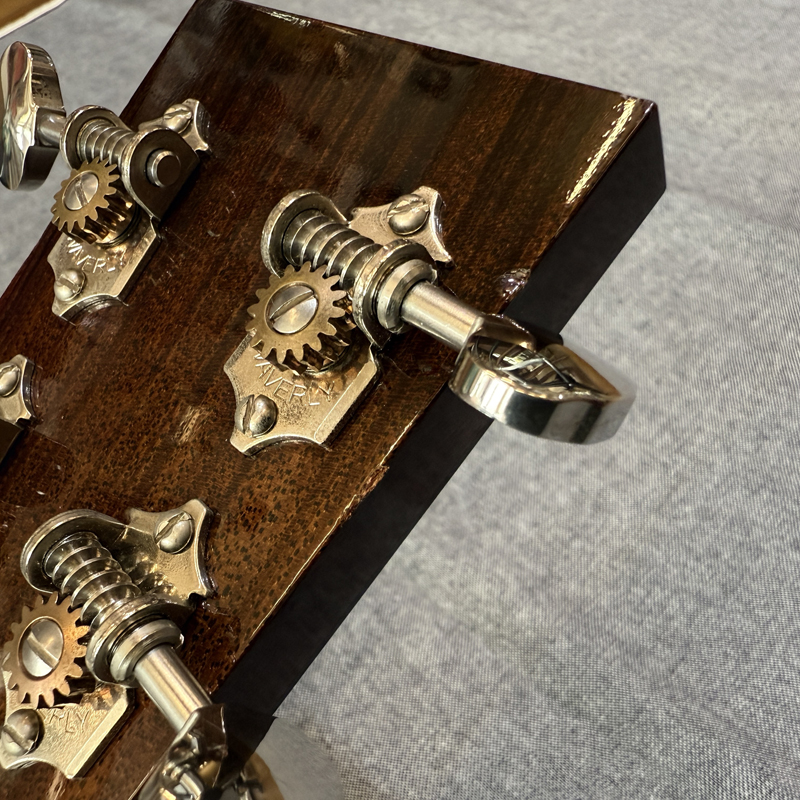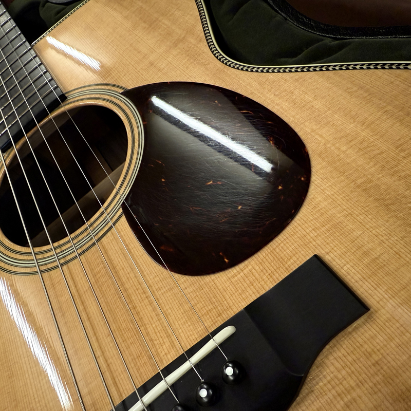 その他、外観上ではトップ板のブリッジ下1弦側に塗装がへこんでいる打痕、ピックガードにスクラッチ跡が少々、ヘッド裏の角にわずかな塗装欠けが数点見られます。