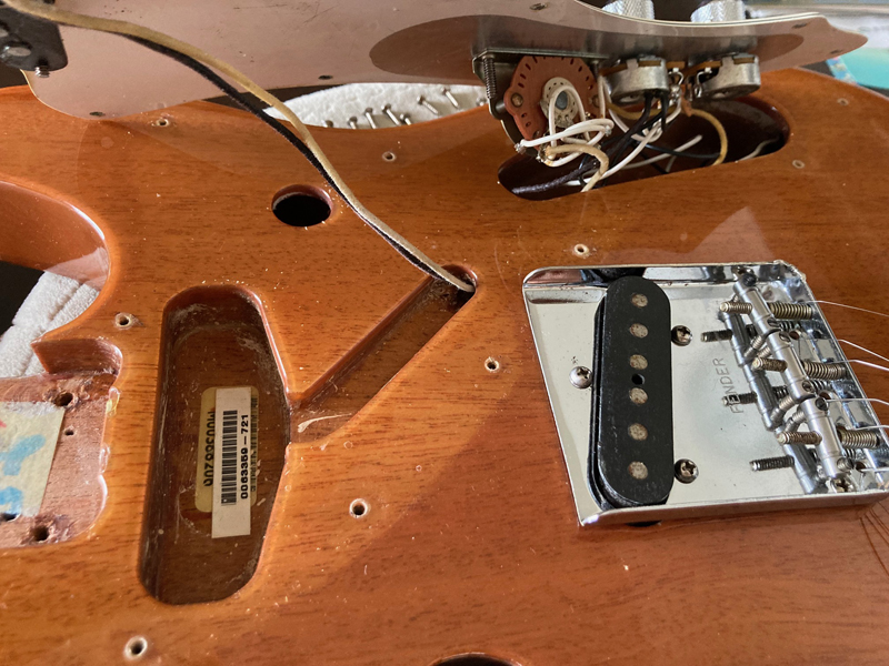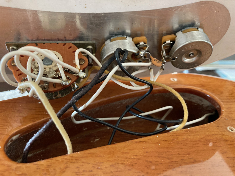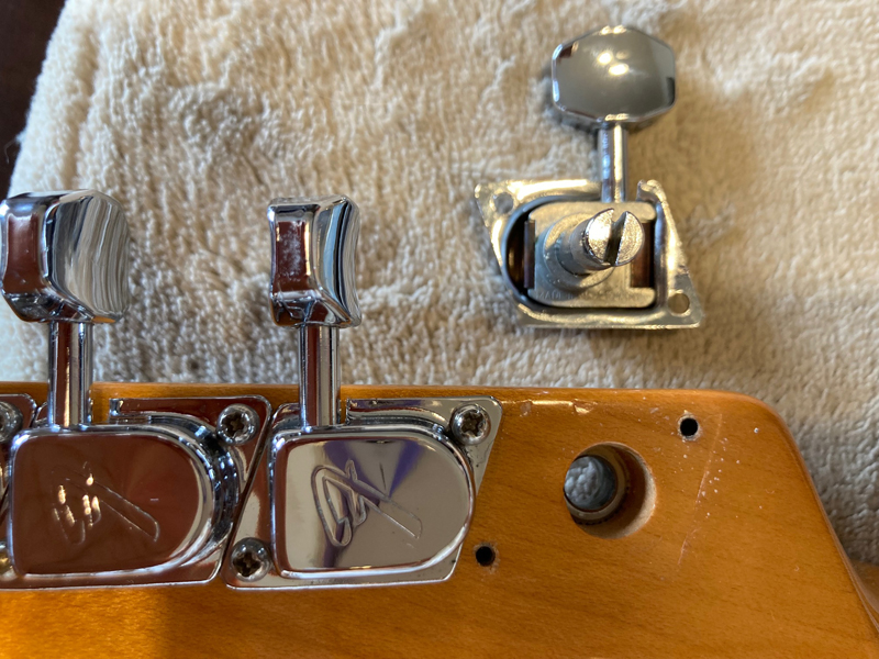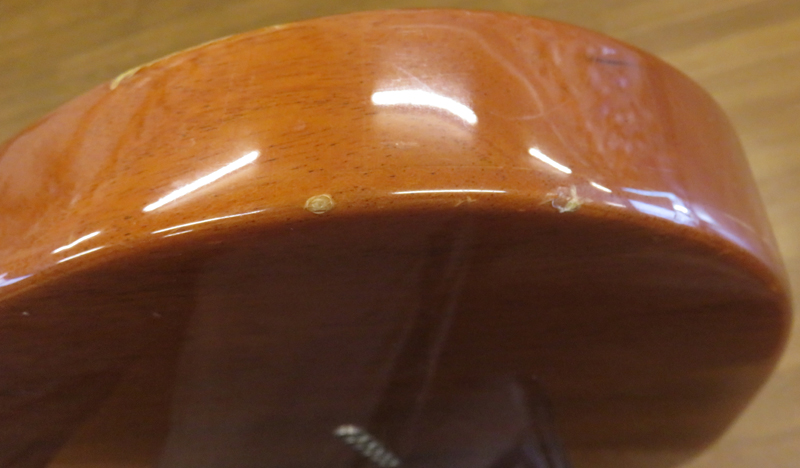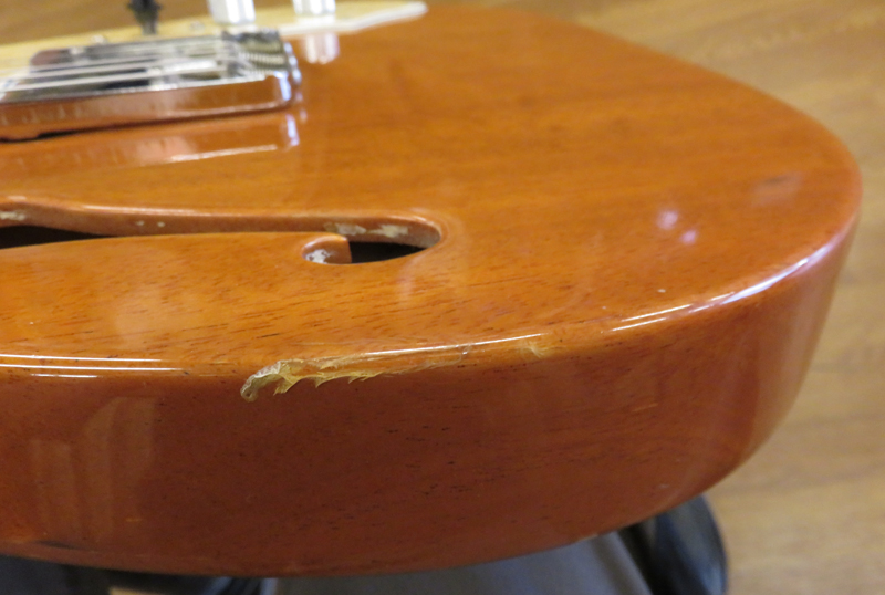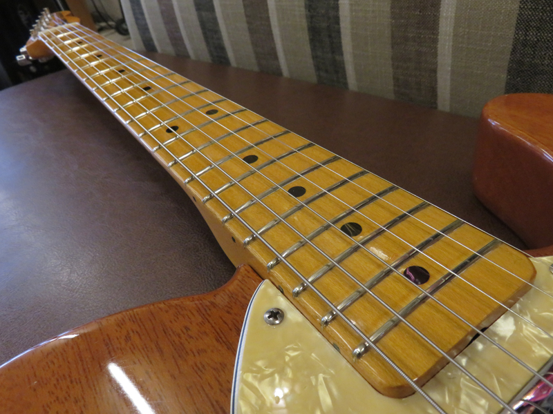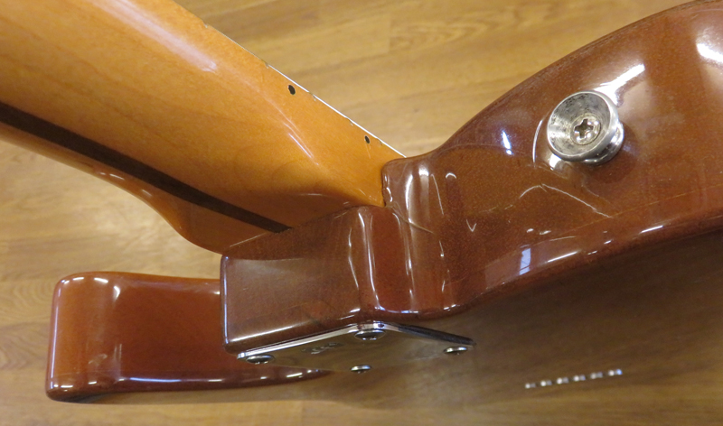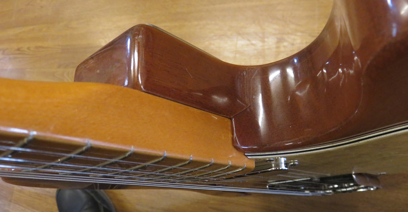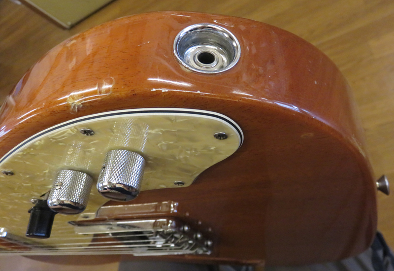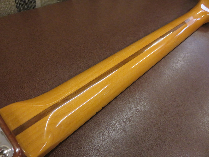 修理歴はFret , Nut , Knob x2 交換。外見的にはバックルウェア、ネックポケット塗装のひび割れ、ネックサイドの塗装剥がれ、ウチキズ、スリキズなど使用感があります。