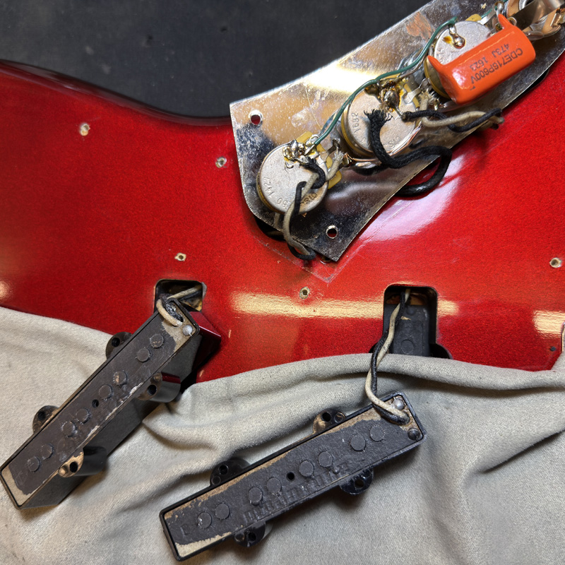 修理歴はPickup , Pickguard , Pot x3 , Capacitor , Jack , Nut , fret , Strap pinsx2 交換。