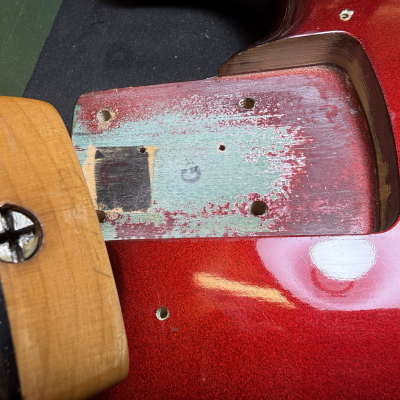 通常この時期はランクを表す"C"スタンプが押されていることが多く見られますが、センターずれや隙間もなくネックポケットの仕込みに違和感は感じられませんので、工場でスクワイヤー用のボディが転用されていた可能性があります。