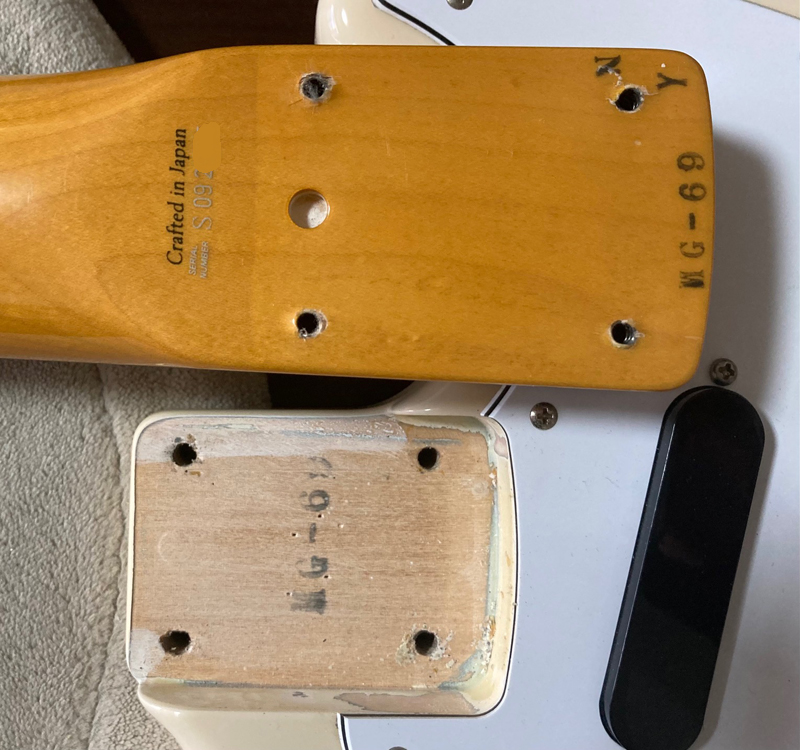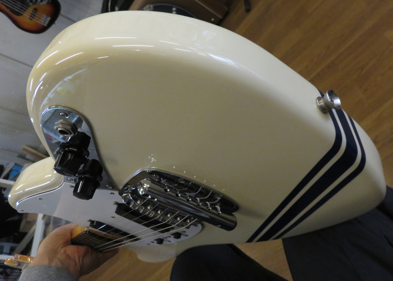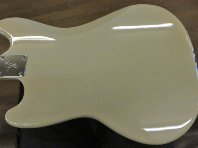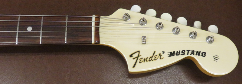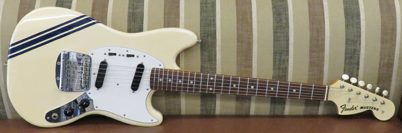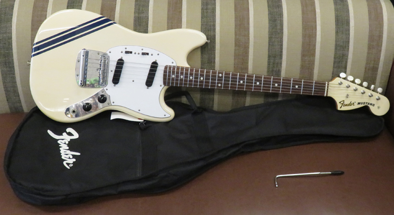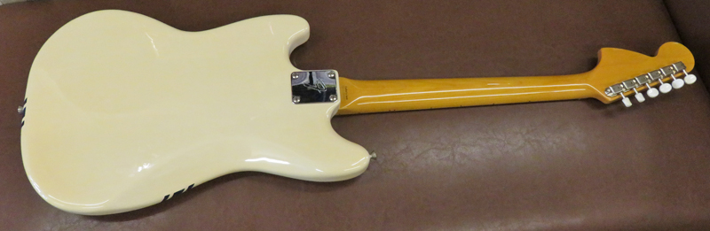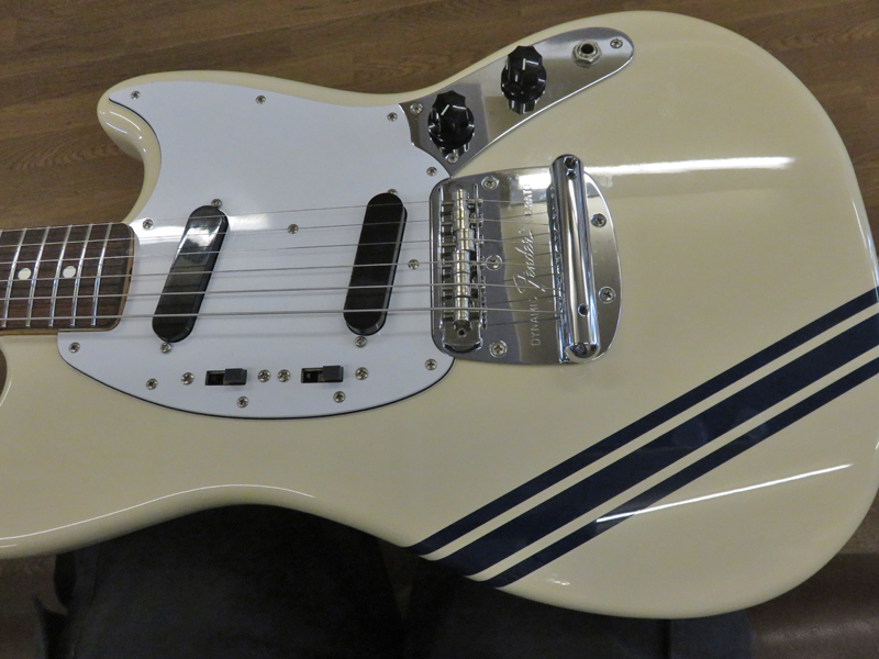 2006-2008年製。CIJ "S"シリアル期。バックコンターのある1970年代のムスタングをイメージしたギター。バスウッドボディ、プラノブペグ、カレントロゴ仕様。ナット幅は約40ミリでやや薄めのネックグリップです。ホワイトのボディに濃紺のストライプが入ったお洒落なルックスです。ボディ、ネックポケットに"MG69"のスタンプが見られますが、おそらく流用されたものと推測されます。