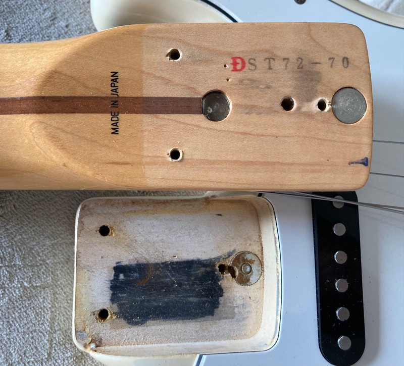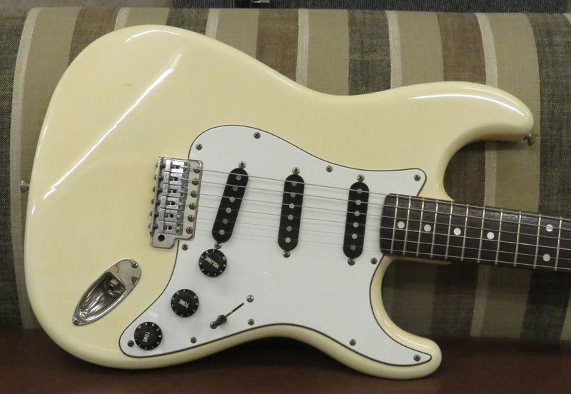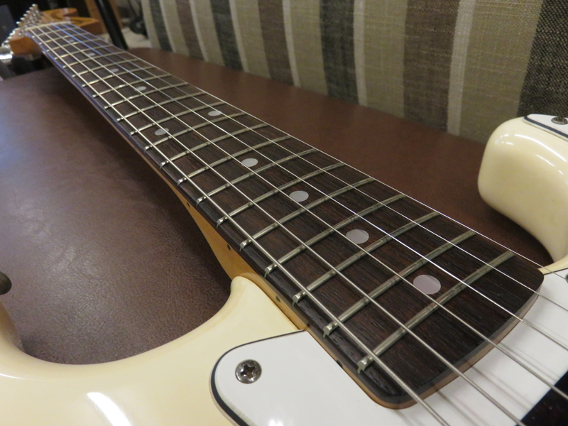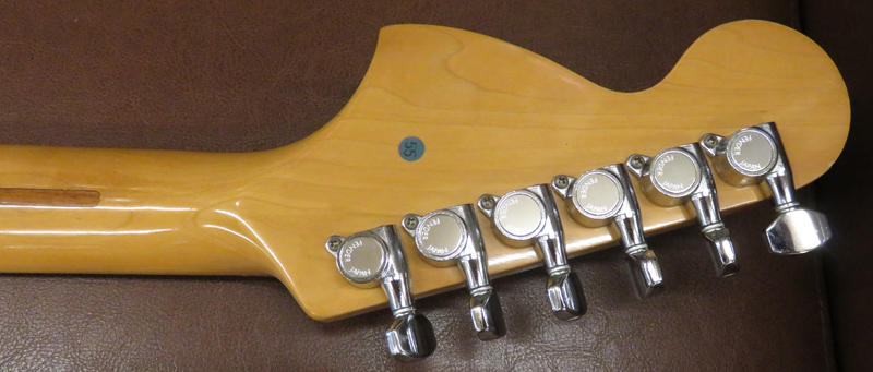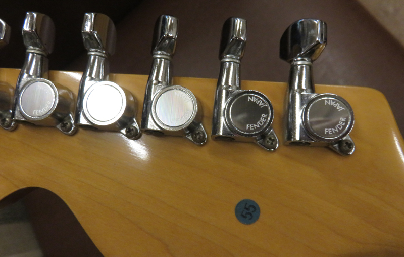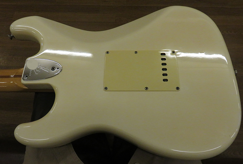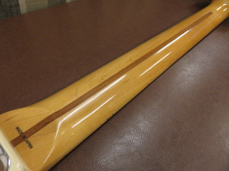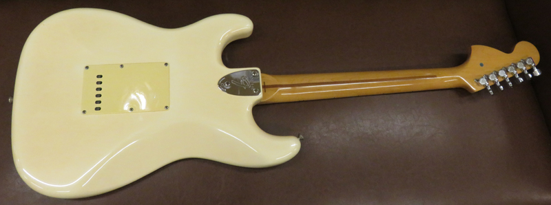 オリンピックホワイトのバスウッドボディ、ラージヘッドストック、ローズ指板、3点止めネック、国産シングルコイルピックアップを3基搭載。ナット幅は約42mm、やや薄めのネックグリップです。ネックエンドに"ST72-70"スタンプが見られますがおそらく旧品番のネックを流用したものと思われます。ヘッドストック裏に型番を表す丸い"55"のシールが貼り付けられています。