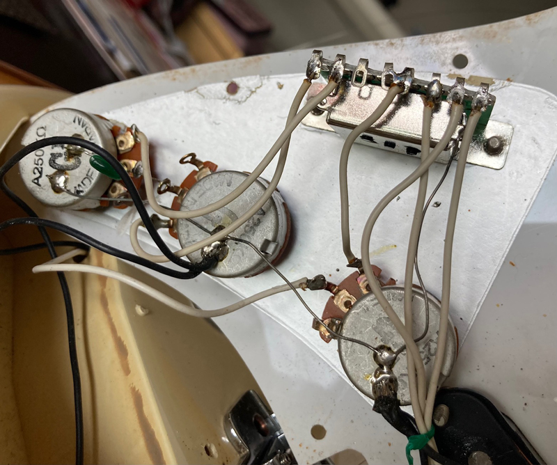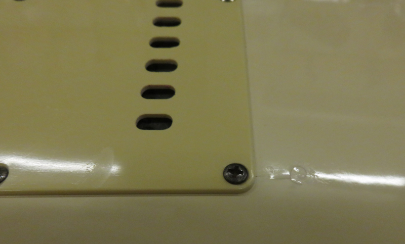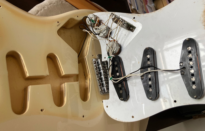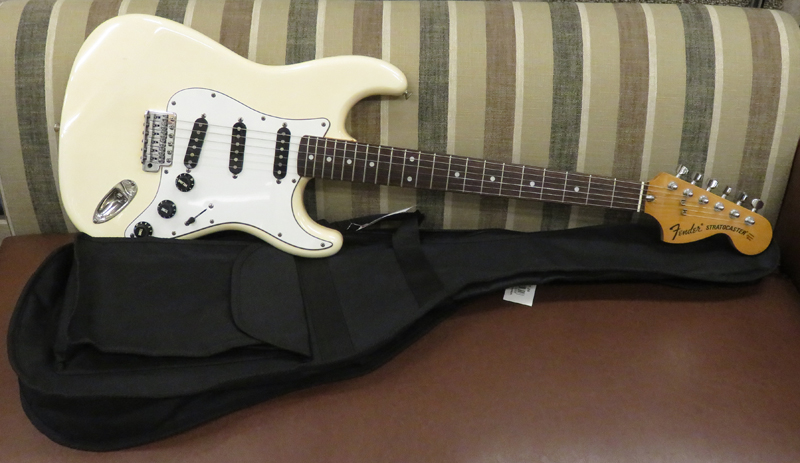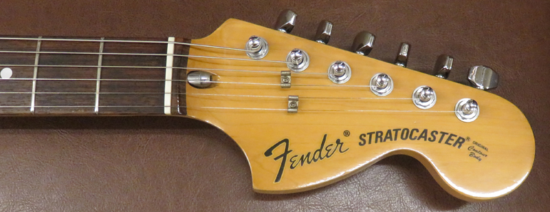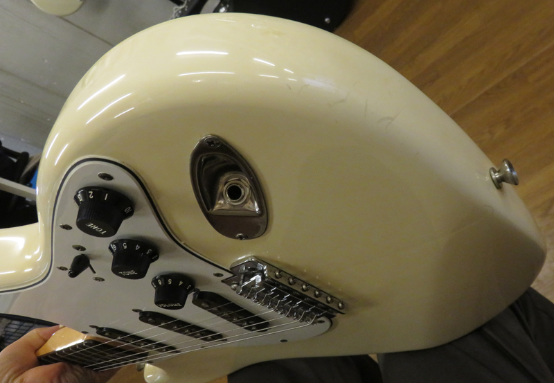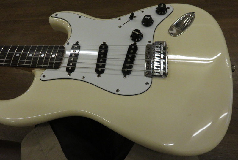 オリンピックホワイトのバスウッドボディ、ラージヘッドストック、ローズ指板、3点止めネック、国産シングルコイルピックアップを3基搭載。ナット幅は約42mm、やや薄めのネックグリップです。ネックエンドに"ST72-70"スタンプが見られますがおそらく旧品番のネックを流用したものと思われます。ヘッドストック裏に型番を表す丸い"55"のシールが貼り付けられています。