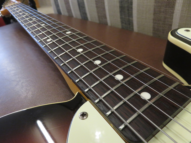 現在ネックはほぼストレート、トラスロッドは両方向に動作確認済、フレットは約80%位の残りです。使用弦:009-042 。社外品汎用ソフトケース付き。