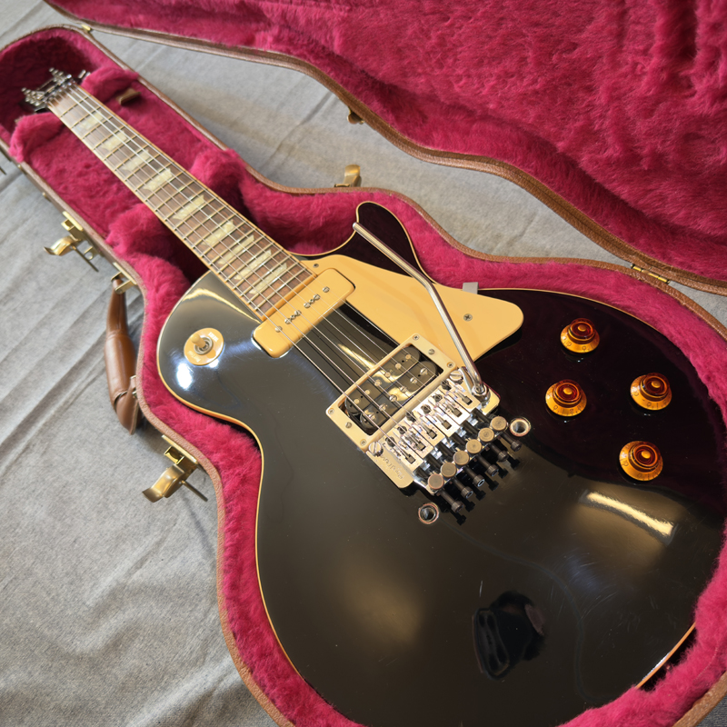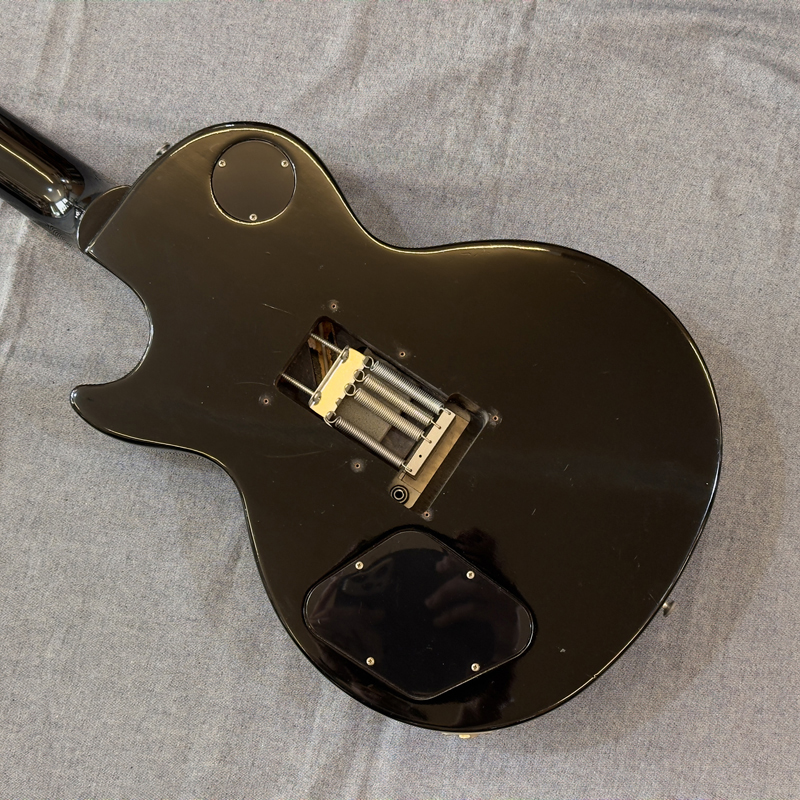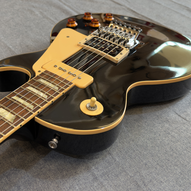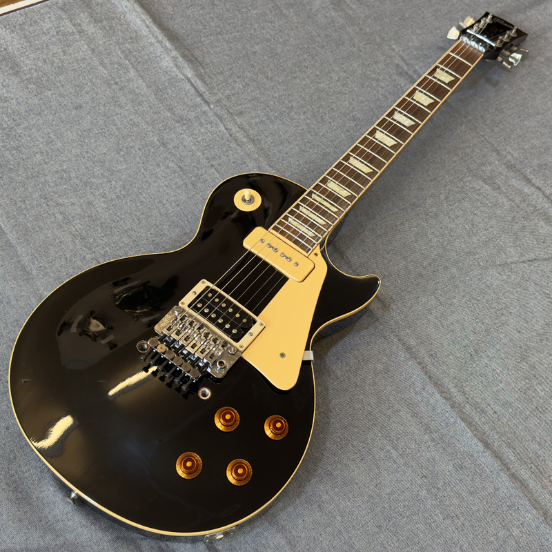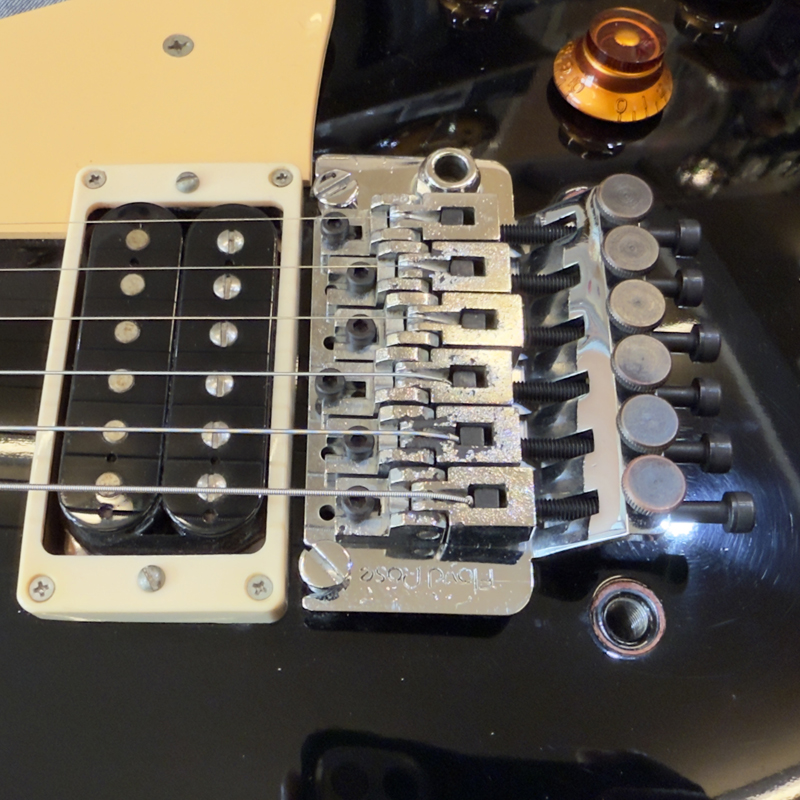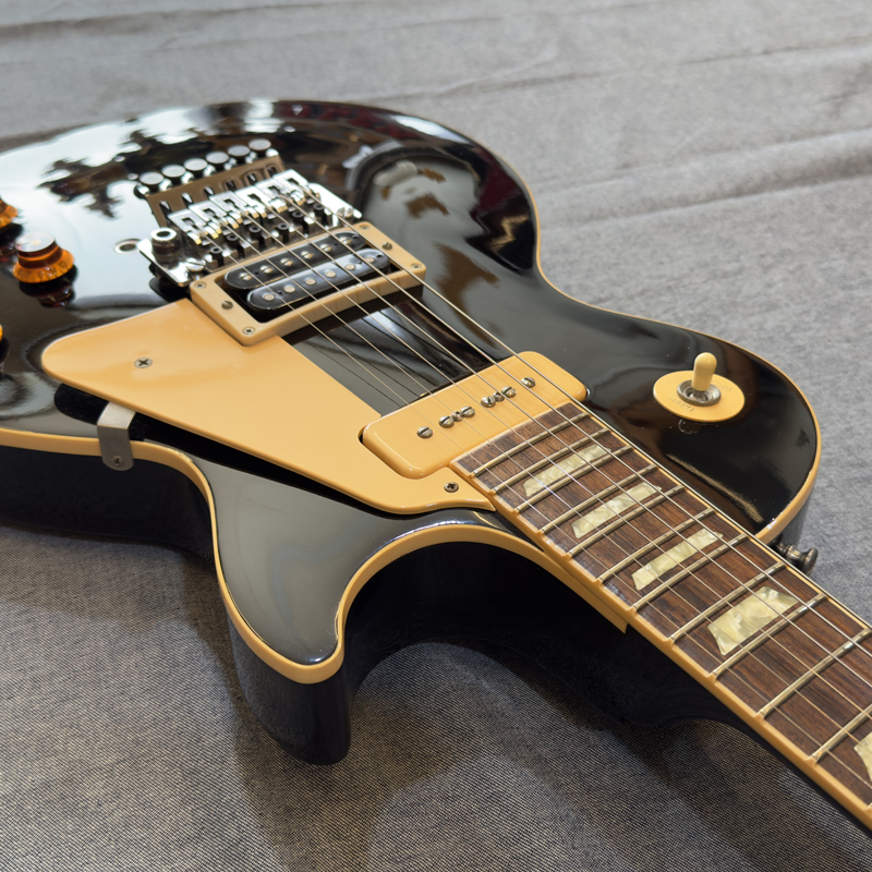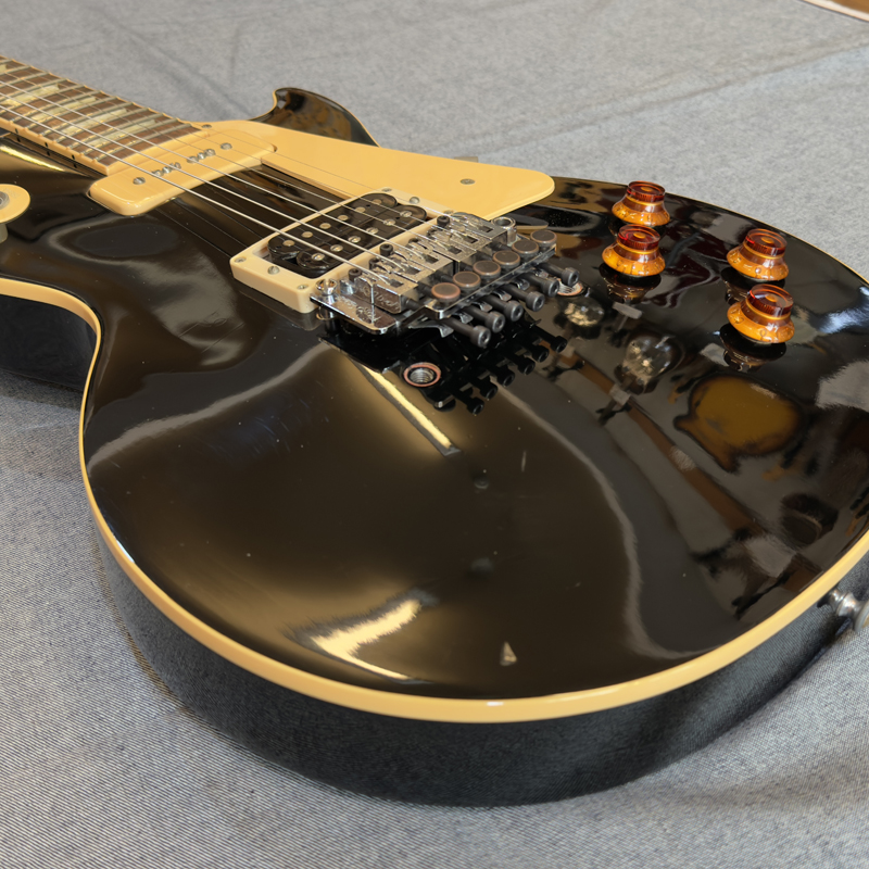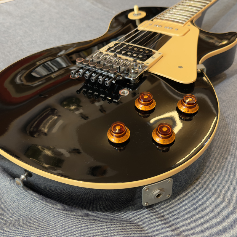 本機、細部を見ると100%の再現モディファイではありませんが、BLACKのレスポールにフロイドローズ(FRT)を搭載してしまうという、大胆で特徴的な改造をされている点で、もうかなりの物。