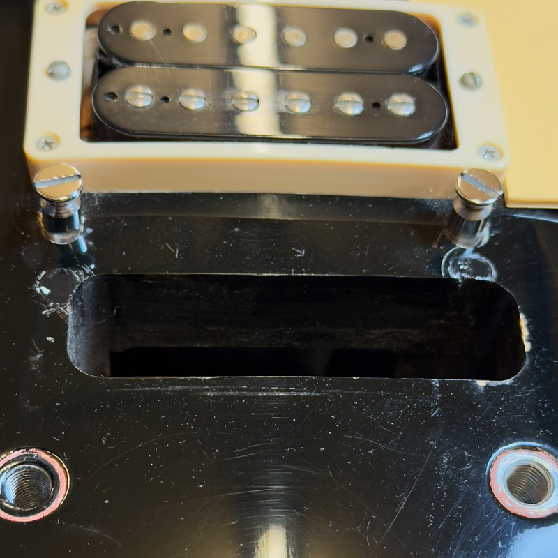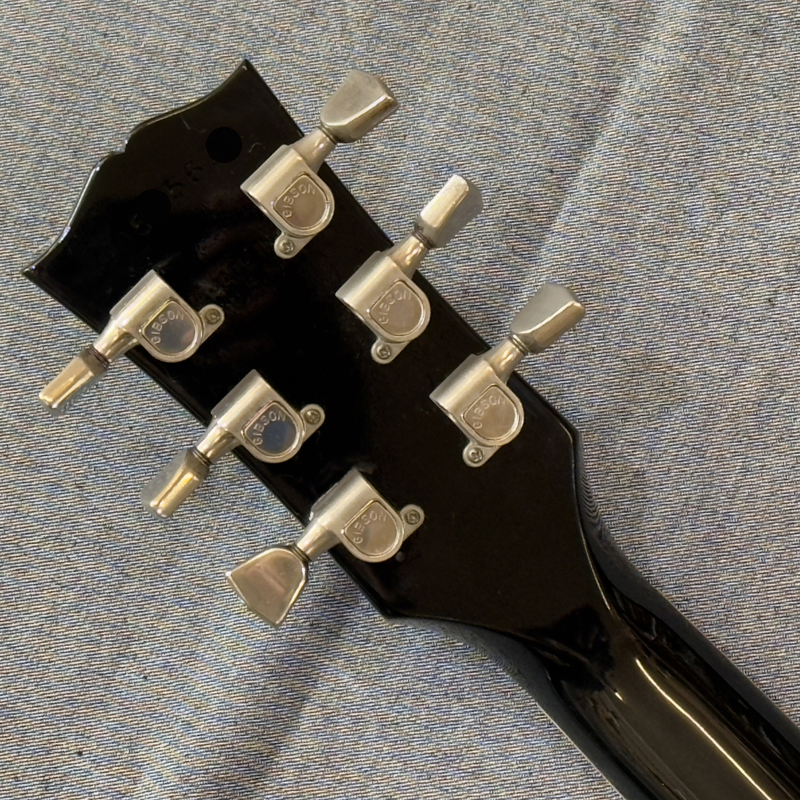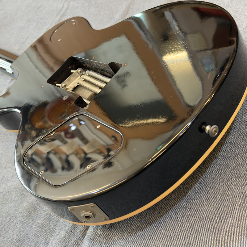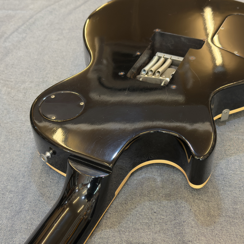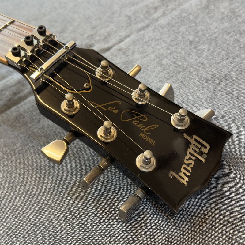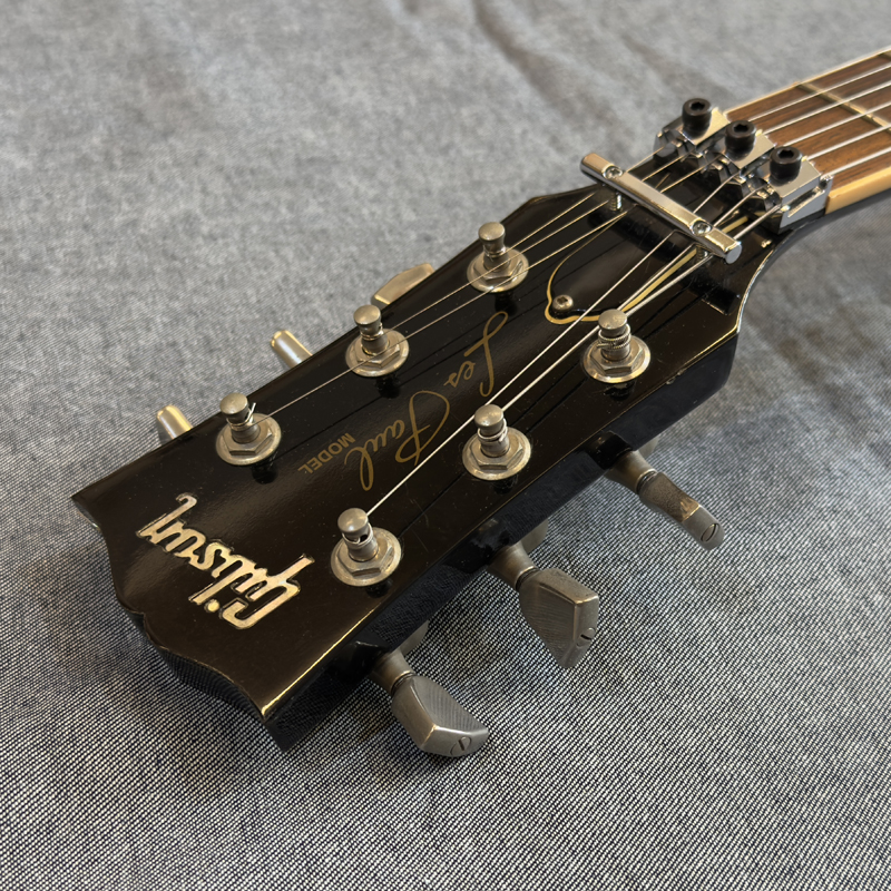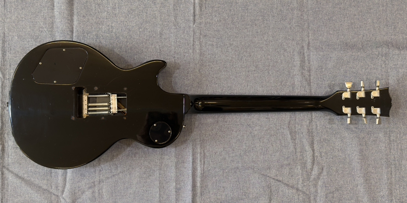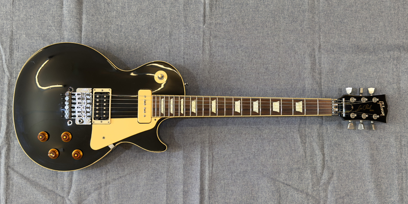 本機、細部を見ると100%の再現モディファイではありませんが、BLACKのレスポールにフロイドローズ(FRT)を搭載してしまうという、大胆で特徴的な改造をされている点で、もうかなりの物。