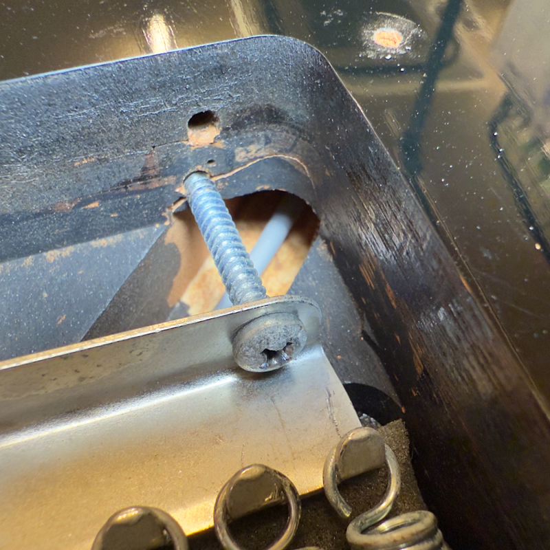 ●FRTのバックザグリ内、スプリングハンガーを止める木ネジ部分に位置修正した部分があり、更に止まっている木部に一部割れがあります。
