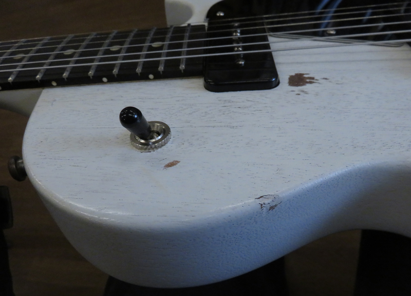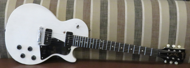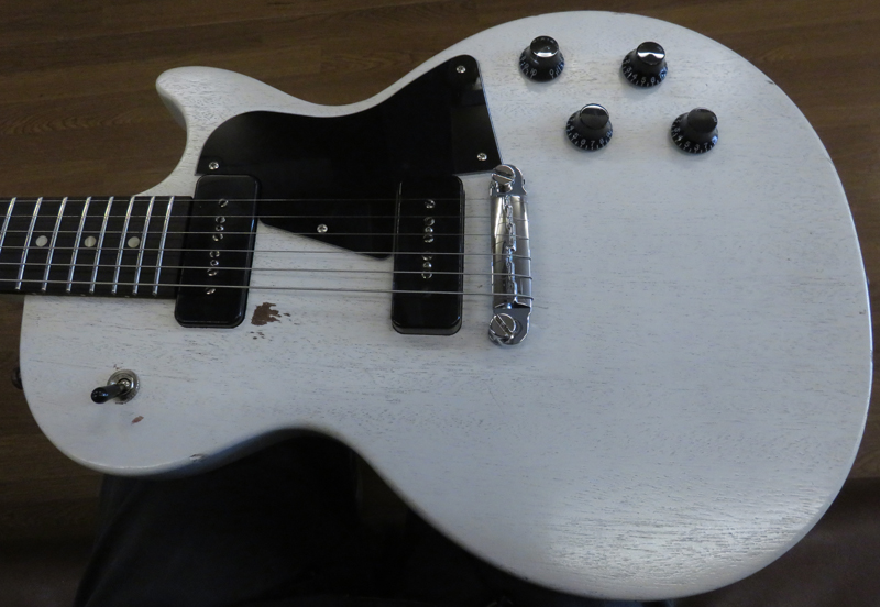 2020年製。シングルカッタウェイのマホガニーボディにP-90 Pickupを2基搭載、ブリッジとテールピースが一体となったラップアラウンドブリッジを採用したモデル。フィニッシュは極薄で使用により所々剥げた箇所も見受けられます。3.54キロと標準的な重量で取り回しが良く、P-90の歯切れのよいロック向きのサウンドが特徴。ナット幅は約42ミリ、やや薄めのネックグリップです。