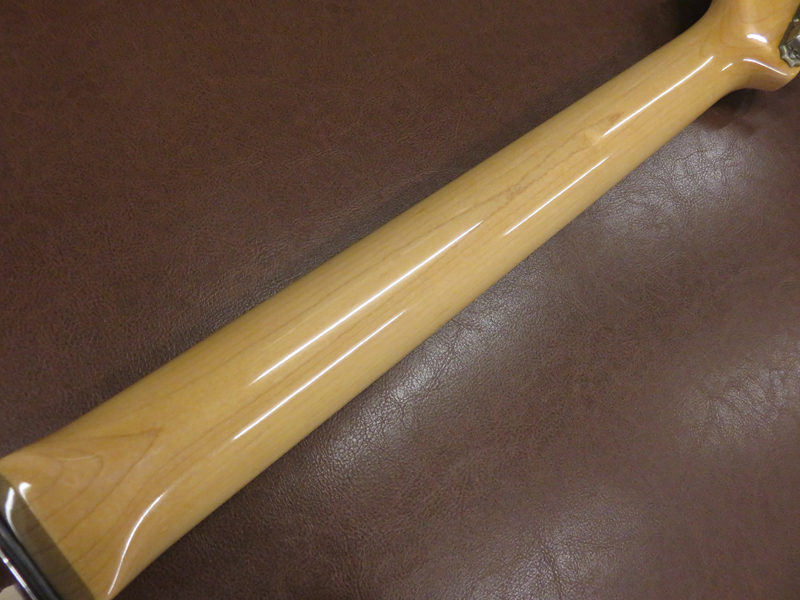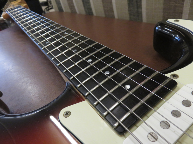 現在ネックはほぼストレート、トラスロッドは両方向に動作確認済、フレットは弦の下にへこみがあり減ってきている部分で約70-75%位の残りです。通常の弦高であれば演奏上特に問題になるようなビリツキはありません。