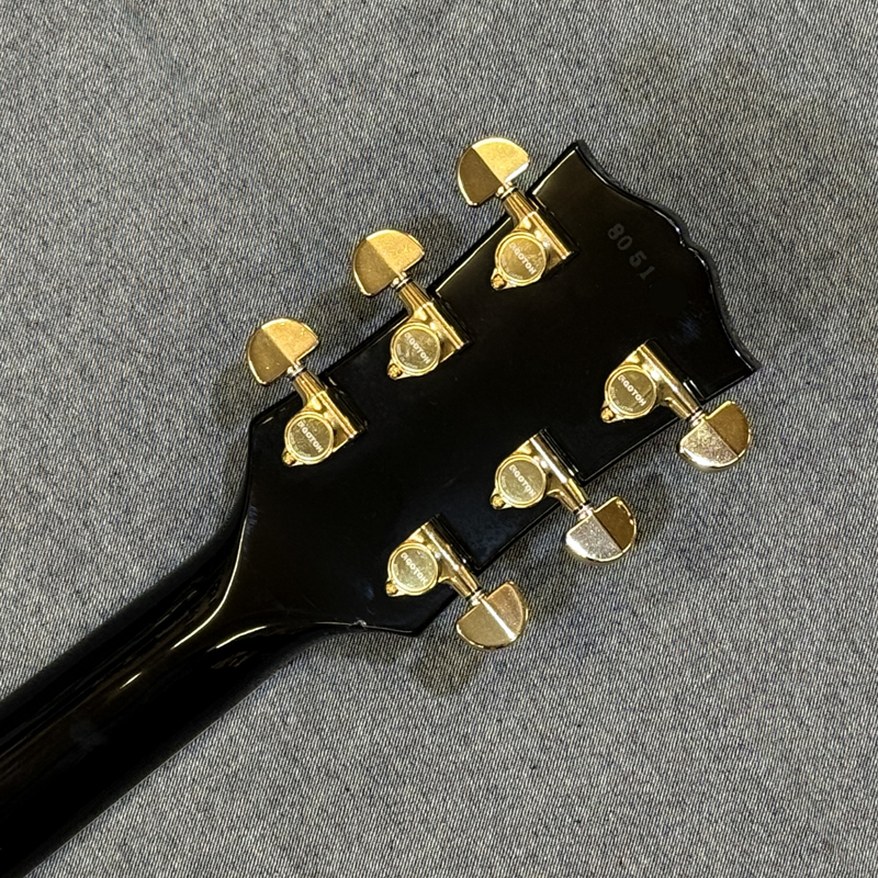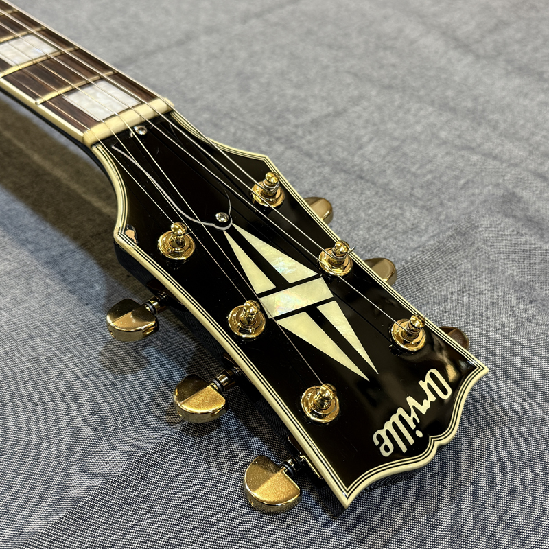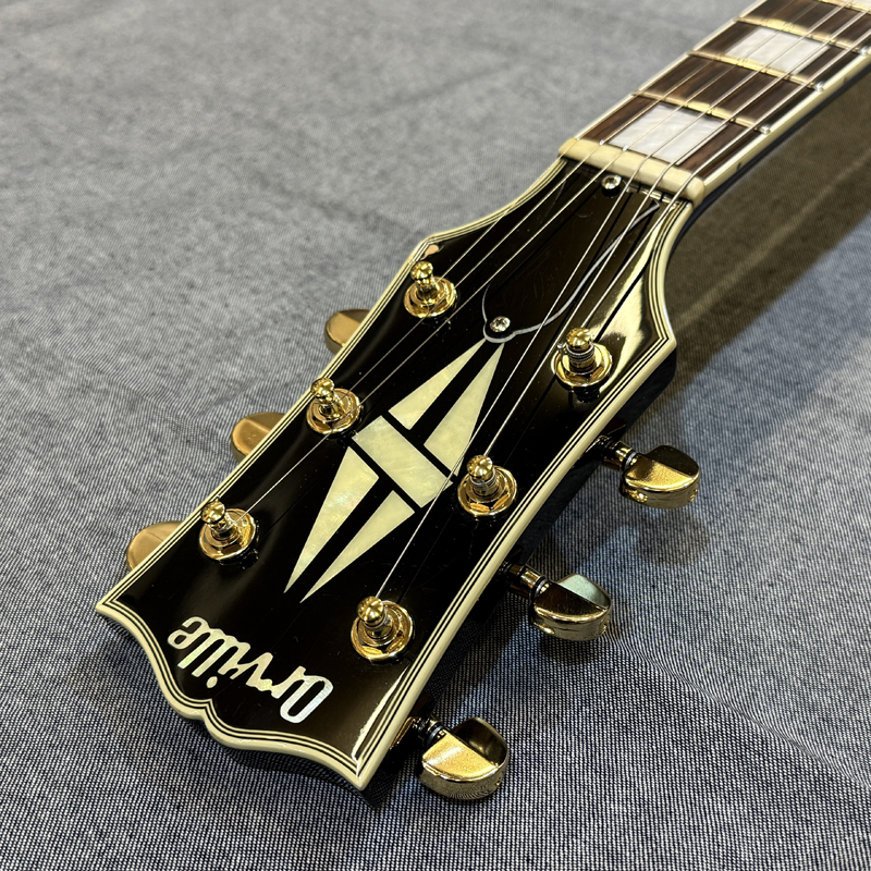 ヘッドのスプリットダイアモンドインレイと、指版のブロックポジションマークにより、精悍なレスポールカスタムのルックス。