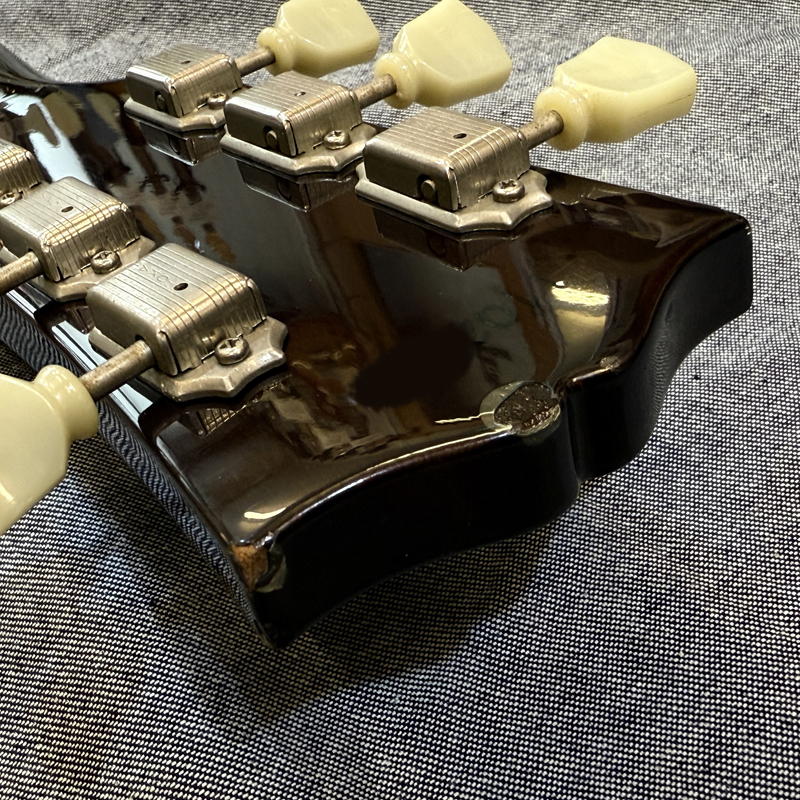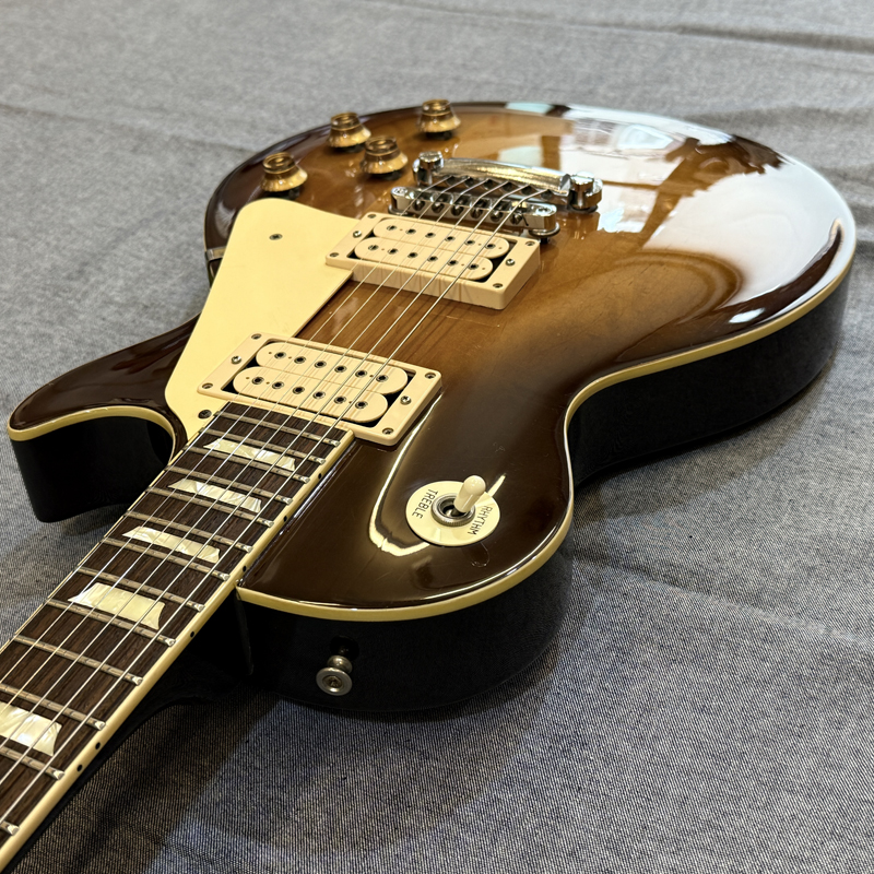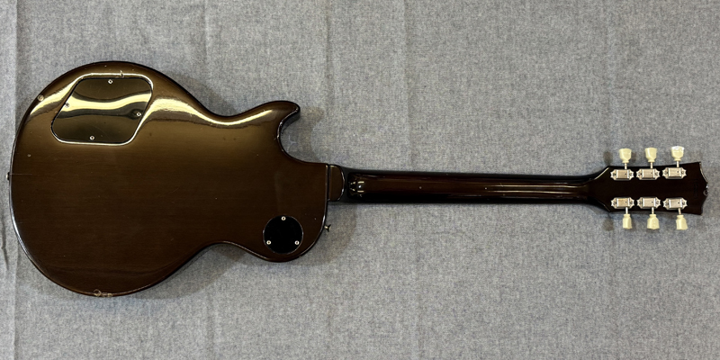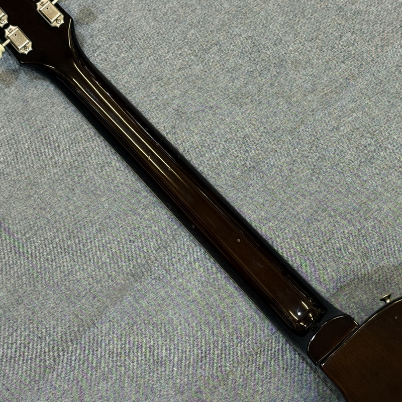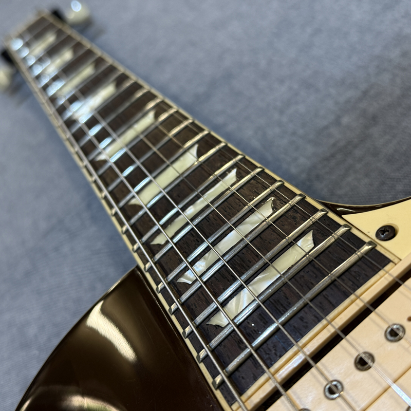 ピックアップはオリジナルのGotoオープンタイプが2基搭載。ディマジオのスーパーディストーションのようなルックスですが、ハイパワーではなく繊細なチャリっとしたサウンドが特徴です。ナット幅は約43ミリ、ローフレット近辺はやや薄めのネックグリップでハイポジションになると肉厚のしっかりとしたグリップになります。